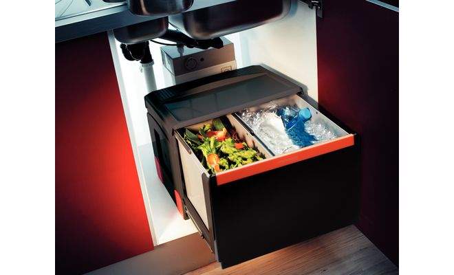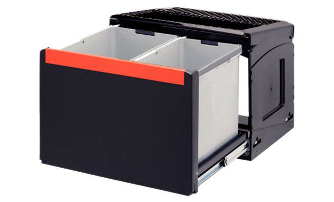 Сміттєвий 2-секційний контейнер з механізмом повного (ручного) висуву. Комплект складається з 2 сміттєвих контейнерів ємністю 14 та 18 л. Сміттєзбірник призначений для ширини корпуса від 500 мм, для монтажу за поворотними дверима. Висувний елемент виготовлений зі сталі, контейнери виготовлені з пластмаси сірого кольору, облицювання ручки та кришка виготовлені з пластмаси чорного кольору. Монтаж виконується шляхом пригвинчування до нижньої панелі.