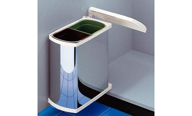 Така конструкція вбудовується в меблі і полегшує сортування сміття. Хоча в відрах можна також зберігати овочі, корм для тварин. Після висунення кришка відкидається в сторону. У закритому положенні вона щільно прилягає до загального металевого контейнера та перешкоджає поширенню запахів. Мішок для сміття затискається сусіднім відром для сміття і загальним корпусом. Для зручності передбачені ручки, які укладаються з боків до загального контейнера і також фіксують пакети. Весь механізм монтується на внутрішню сторону дверцят або бічну частину тумбочки.