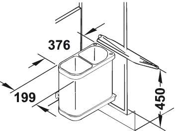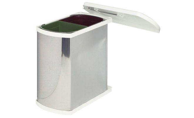 2-секційний сміттєзбірник для монтажу за поворотними дверима. Комплект складається з 2 секцій ємністю 8 л. Сміттєзбірник призначений для ширини корпуса від 450 мм. Корпус для контейнера виготовлений з нержавіючої сталі з пластмасовою основою і обідком білого кольору, внутрішній контейнер – з пластмаси світло-сірого кольору. Монтаж виконується шляхом прикручування гвинтами до бічної стінки шафи, для кріплення зліва і справа.