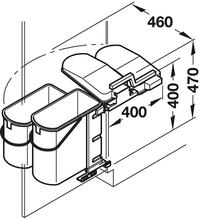 Подвійний сміттєзбірник для монтажу за поворотними дверима. Комплект складається з 2 контейнерів ємністю 10 та 19 л. Сміттєзбірник призначений для ширини корпуса від 500 мм. Тримач виготовлений зі сталі з пластмасовим покриттям сірого кольору, контейнери та кришки виготовлені з пластмаси сірого кольору. Монтаж виконується шляхом пригвинчування до бокової стінки шафи, для кріплення зліва та з права.