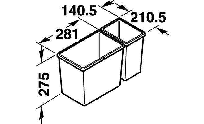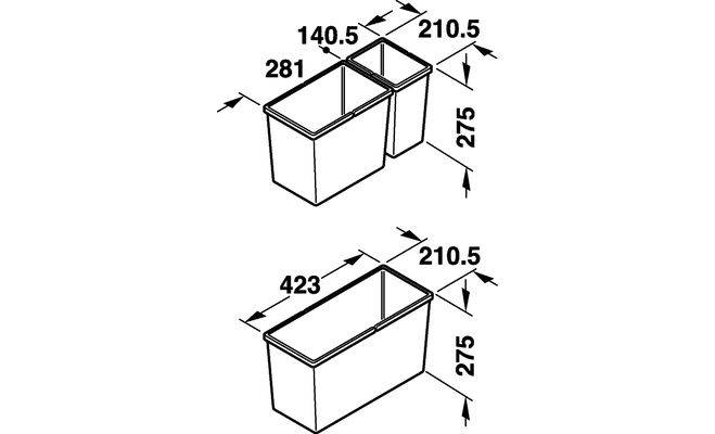 3-секційний сміттєзбірник для монтажу за лицевими панелями. Комплект складається з 3 контейнерів: 1 х 6 л, 1х 8,5 л, 1 х 21л . Сміттєзбірник призначений для ширини корпусу від 300 мм,для товщини бічної панелі 19 мм, номінальна довжина 500 мм. Контейнери виготовлені з пластмаси сірого кольору. Монтаж виконується шляхом вставлення в два висувних ящика з механізмом повного висуву Blum Tandembox або Grass Nova Pro.