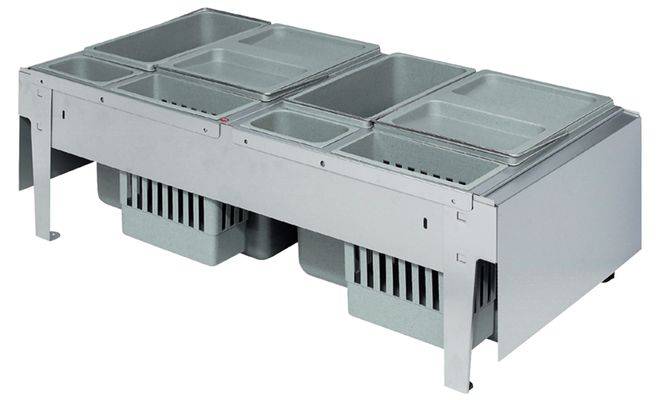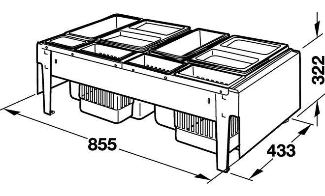 Сміттєві контейнери для вставлення в направляючу систему Blum Tandembox або Grass Nova Pro, для монтажу за лицевою панеллю. Сміттєзбірник призначений для ширини корпуса від 900 мм, та оснащений контейнерами ємністю: 2 х 18 л, 2 х 12 л та контейнерами для посуду 2 х 4,1 л і 2 х 0,7 л. Контейнери з кришками виготовлені з пластмаси сірого кольору, рама виготовлена зі сталі сріблястого кольору. Номінальна довжина 500 мм.