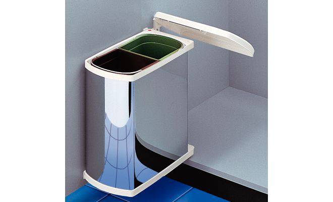 2-секційний сміттєзбірник для монтажу за поворотними дверима. Комплект складається з 2 секцій ємністю по 8 л. Сміттєзбірник призначений для ширини корпуса від 450 мм. Корпус для контейнера виготовлений зі сталі з пластмасовим покриттям білого кольору, внутрішній контейнер виготовлений з пластмаси зеленого і коричневого кольору, кришка виготовлена з пластмаси білого кольору. Монтаж виконується шляхом пригвинчування до бокової стінки шафи, для кріплення зліва та з права.