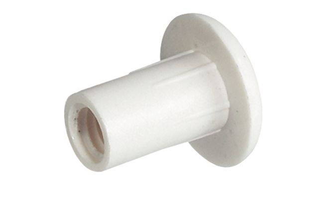 Втулка з внутрішньою різьбою М6, виготовлена з пластмаси коричневого кольору. Параметри втулки: привід-плоский шліц; довжина-15мм; діаметр ніжки -8 мм.