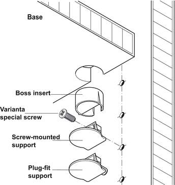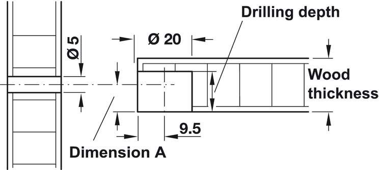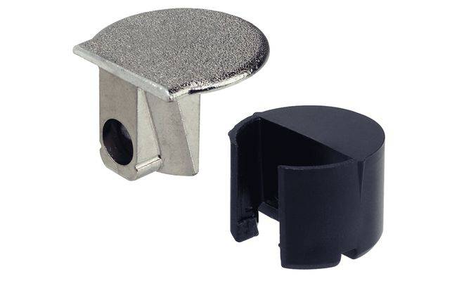 Стяжка RASNT-TAB для отворів діаметром 3 або 5 мм, для товщини деталі від 19 мм. Врізна частина виготовлена з пластмаси, несуча частина виготовлена з цинкового сплаву з нікельованою поверхнею. Монтаж несучої частини виконується шляхом вставлення або пригвинчування, врізна частина - шляхом запресовування в отвір.