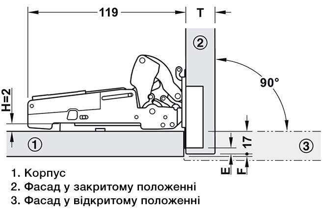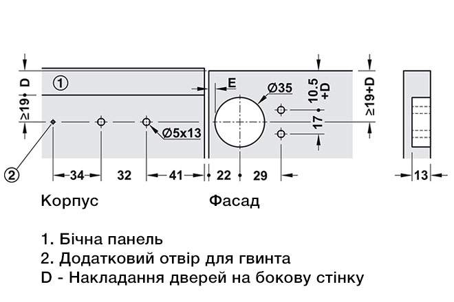 регулювання по глибині - від 0,5 до +2,8 мм - Накладання дверей на бокову стінку: 17 мм (фіксована)