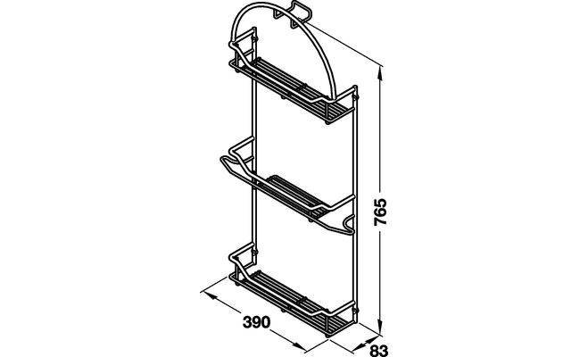 Тримач для аксесуарів до пилососу, у вигляді полиці з трьома поверхами та тримачем для шлангу. Тримач виготовлений з хромованої сталі. Розміри: ширина 390 мм, глибина 83 мм, висота 765 мм. Монтаж тримача виконується шляхом прикручування гвинтами.