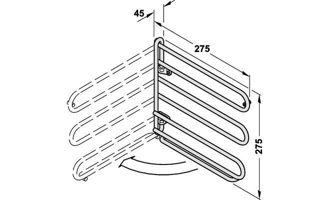 Універсальний гардеробний держатель. Виконаний з сталевої труби, хромований. Повертається на 90 °. Розмір 275х275х45мм.