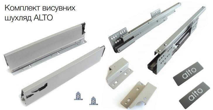 Завдяки наявності великої кількості опцій, а саме різним варіантам комплектацій – 84, 164 та 204 мм система висувних шухляд Alto має широке застосування.