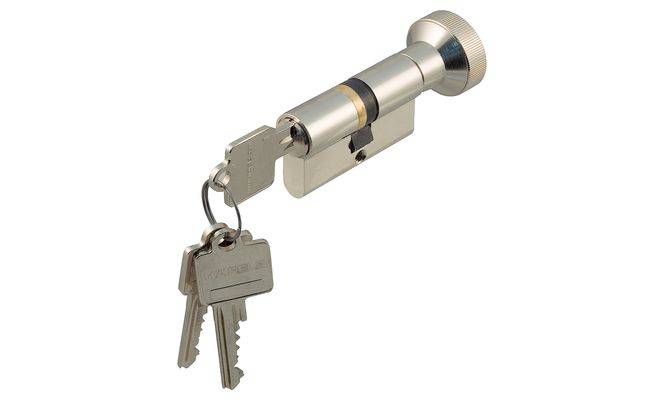 Циліндр з поворотним ключем, стандартний профіль, без функції аварійного відкриття, Startec. Звичайний ключ, розмір A: 31 мм, розмір B: 40 мм, розмір C: 71 мм. Діаметр поворотного ключа 30 мм. Глибина поворотного ключа 30 мм. Система замикання з 5 штифтами. Система замикання: Стандартний профіль. Висота циліндра 33 мм. Колір/покриття циліндра: нержавіюча сталь. Особливості: звичайний ключ. Матеріал циліндрового корпусу: латунь. Матеріал дверної ручки: латунь. Колір/покриття поворотного ключа: нержавіюча сталь. Стандарт: сертифіковано відповідно до DIN 18252 та EN 1303. У комплекті 1 профільний циліндр з поворотним ключем, 3 ключі з нікельованої сталі, 1 гвинт кріплення M5 x 80 мм