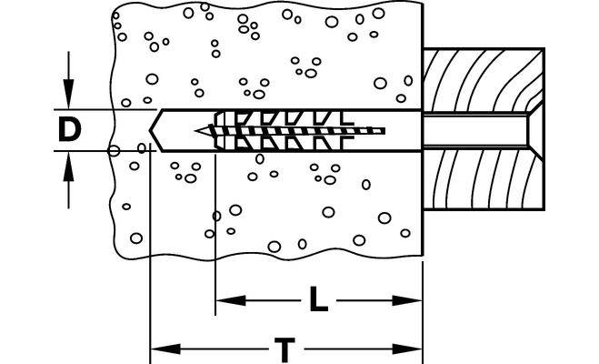 Ударний дюбель з гвинтом виготовлений з поліаміду сірого кольору, гвинт з потаємною голівкою виготовлений зі оцинкованої сталі. Дюбель застосовується для бетону, природного каменю, пустотілої цегли, силікатної цегли, газобетону, легкого бетону, стяжки та інших будівельних матеріалів. Розміри дюбеля (мм): розміри 6х40 мм, діаметр свердла 6 мм, глибина свердління отвору ≥50, довжина дюбеля 40 мм.