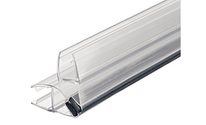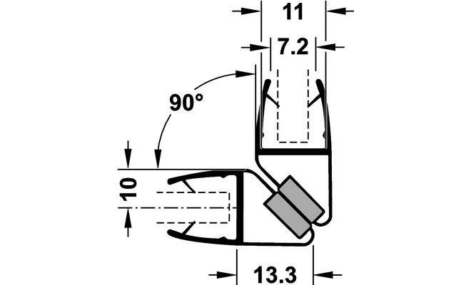 Технічні характеристики Ущільнювач PVC для скляних дверей прозорий з магнітом 90° для товщини скла 8 - 10 мм 2000 мм 95006520