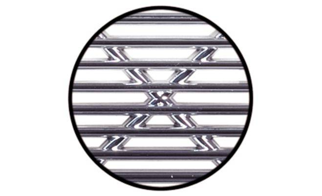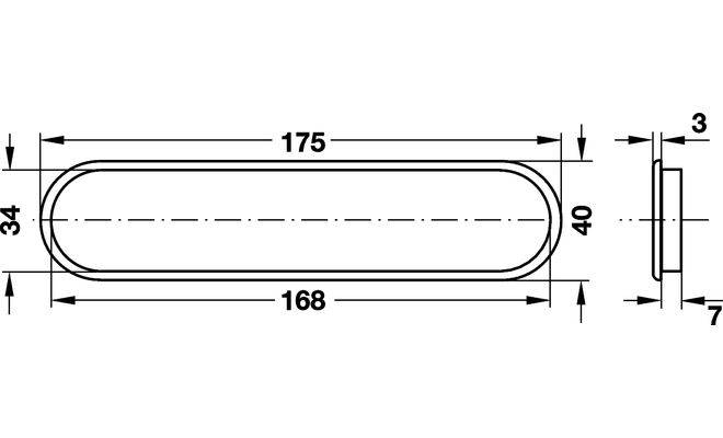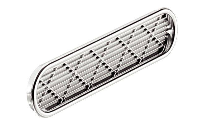 Вентиляційна решітка овальної форми з прорізами та захисною кромкою, виготовлена з пластмаси з хромованою, полірованою поверхнею. Ширина решітки з кромкою 40 мм, ширина решітки без кромки 34 мм, довжина з кромкою 175 мм, довжина без кромки 168 мм, товщина 7 мм, товщина кромки 3 мм, площа проходу 12 см². Монтаж вентиляційної решітки виконується шляхом врізання, кріплення шляхом приклеювання.