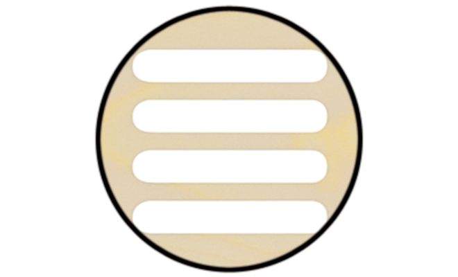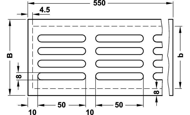 Прямокутна вентиляційна решітка з прорізами, виготовлена з натуральної, масивної,3-шарової клеєної деревини дуба з тонко відшліфованою поверхнею. Решітка володіє стійкістю до впливу температур та вологості, верхній шар решітки виготовлений з цільної заготовки, продольні кромки сфальцовані і заокруглені, торцеві кромки гладкі. Ширина решітки 100 мм, довжина 550 мм, товщина 15 мм, площа проходу 202 см². Монтаж вентиляційної решітки виконується шляхом врізання.