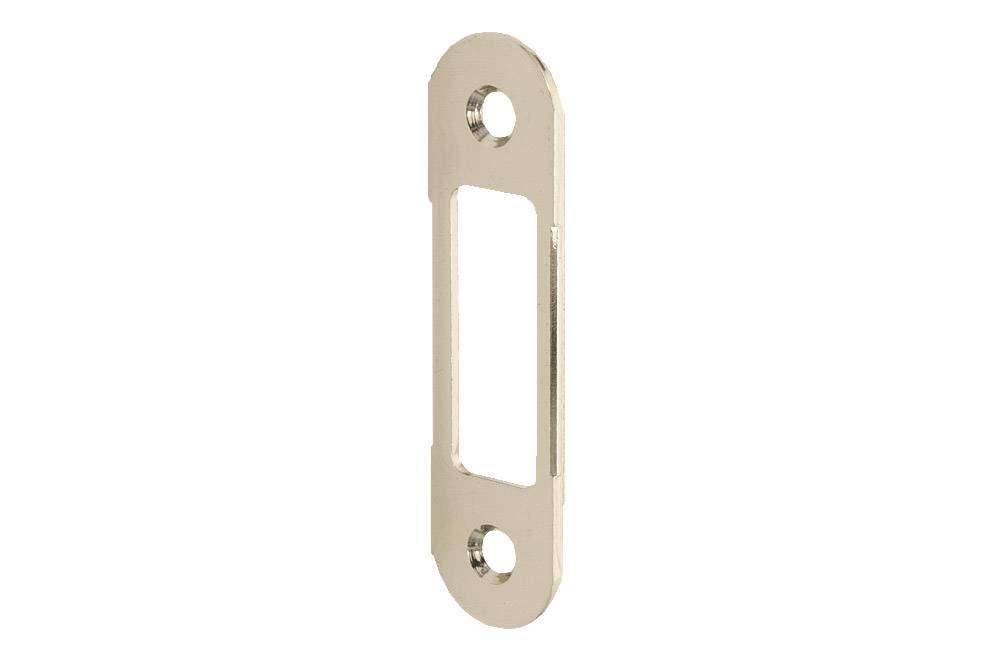 Планка дверного замка. Універсальна, права чи ліва по DIN. Матеріал: сталь. Покриття / колір: нікельована полірована. Розміри планки замка: Висота: 82 мм. Ширина: 22 мм. Товщина: 2,5 мм. Розмір отвору під ригель замка: 14 х 39.2 мм.