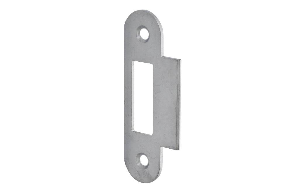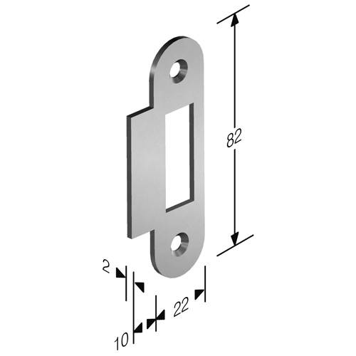 Планка замка, з виступом. Універсальна, права чи ліва по DIN. Матеріал: сталь. Покриття/колір: хромована матова. Розміри планки замка: Висота: 82 мм. Ширина: 22 мм. Товщина: 2 мм. Виступ: 12 мм. Розмір отвору під ригель замка: 12 х 34 мм.