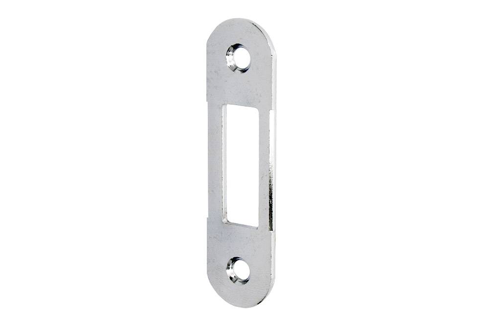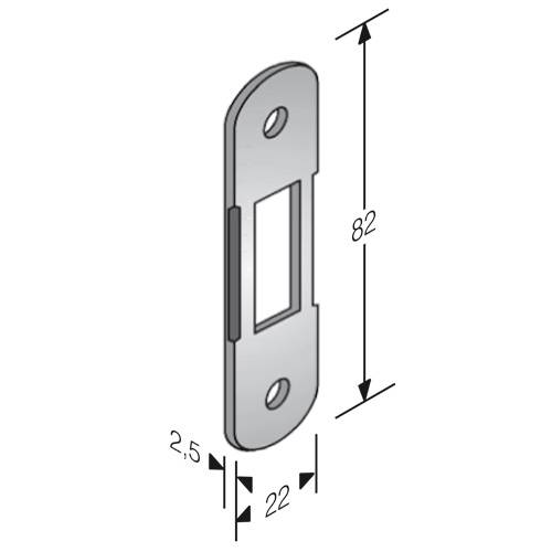 Планка дверного замка. Універсальна, права чи ліва по DIN. Матеріал: сталь. Покриття/колір: хромована полірована. Розміри планки замка: Висота: 82 мм. Ширина: 22 мм. Товщина: 2,5 мм. Розмір отвору під ригель замка: 12 х 34 мм.