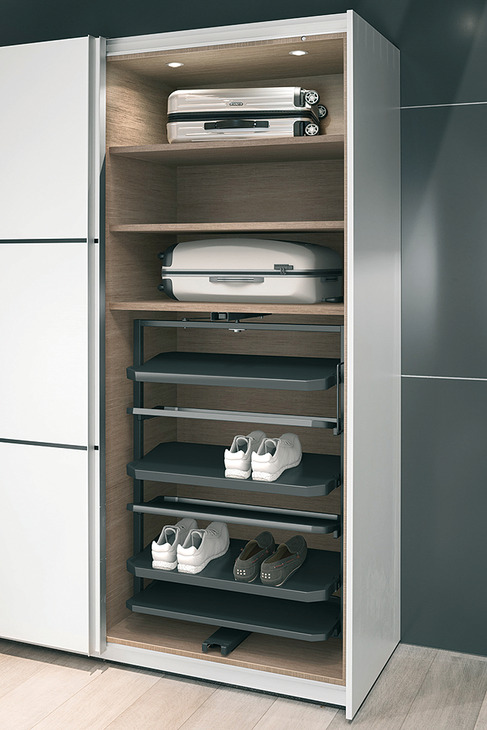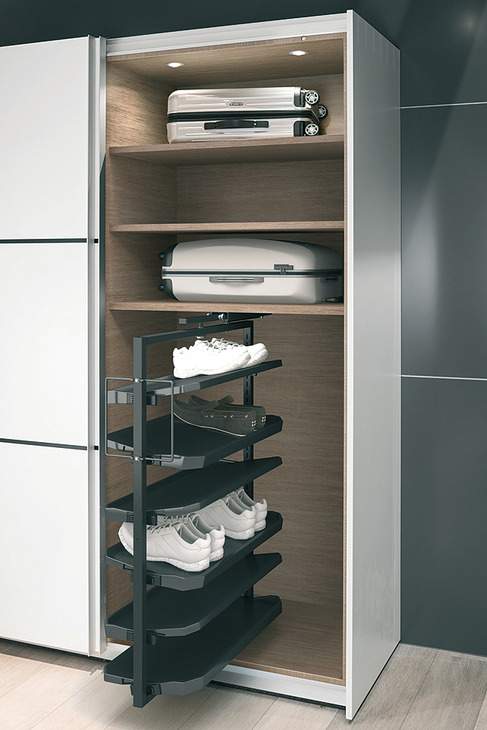 Технічні характеристики Висувна поворотна на 180 градусів рама в шафу для 20 пар взуття з полицями w 800 мм h 1000 мм d 365 мм сталь сіра 80622500
