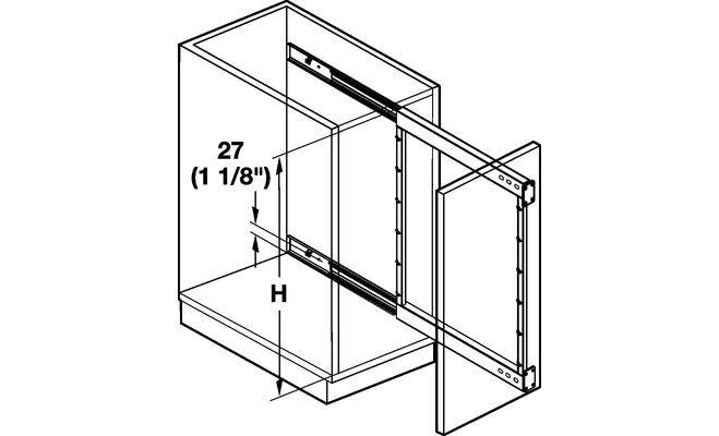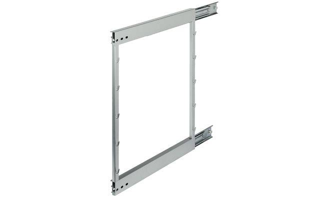 Висувна рама для кріплення до правої сторони шафи, оснащена механізмом повного висуву з самозасувом та амортизатором. Рама виготовлена зі сталі з пластиковим покриттям кольору білий алюміній, призначена для внутрішньої висоти шафи 663 мм, глибина корпусу 485 мм при 90°, 515 мм при 45°, 505 мм при 55°, внутрішня ширина корпусу ширина корзини + 33мм. Розмір висуної рами: ширина 40мм, глибина 470мм, несуча здатність 24 кг. Монтаж корзини виконується шляхом кріплення гвинтами до бічної панелі шафи.