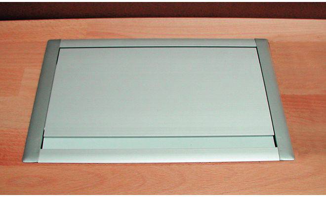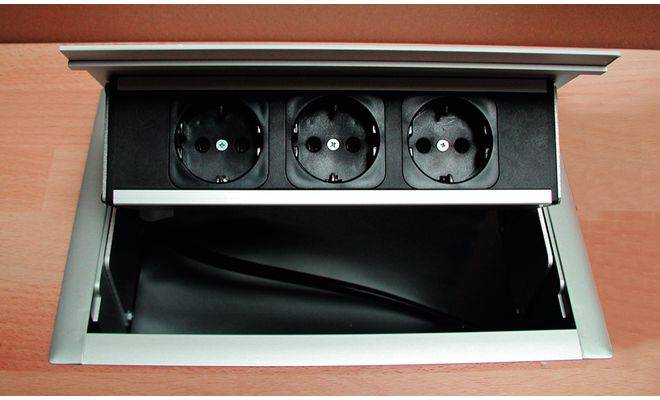 Висувний елемент зі штепсельними розетками та штекерною системою SV16. Має 3 євро розетки. Кришка і рамка виконані з анодованого алюмінію, заглушки з сріблястого пластику, колодка для розеток з чорного пластику. Даний елемент ідеально підходить для застосування в сучасних кухнях або офісах. Для фіксації штепсельних розеток у відкритому і закритому станах в елементі використовуються спеціальні фіксатори. Монтаж виконується шляхом врізання.