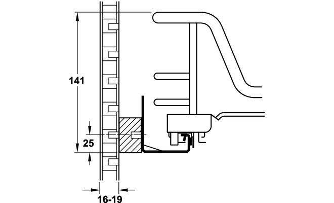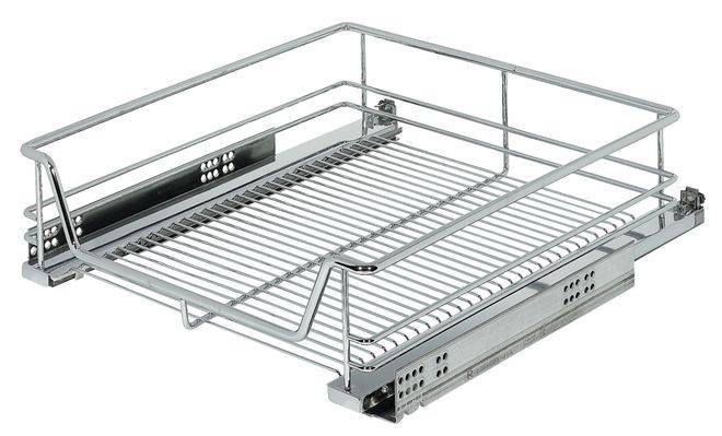 Внутрішній висувний механізм шафи Blum Tandem з вмонтованим амортизатором Blumotion, з направляючими на підшипниках кочення, з нижнім кріпленням ручки, для корпусу шириною 500 мм, призначений для монтажу за лицевими панелями та оснащений решітчатою висувною полицею. Корзина виготовлена з хромованої сталі, направляючі виготовлені з оцинкованої сталі. Несуча здатність висувного механізму 30 кг, глибина встановлення 505 мм, розмір корзини: ширина 420 мм, глибина 500 мм, висота 127 мм. Монтаж виконується шляхом кріплення гвинтами до бокових стінок шафи.