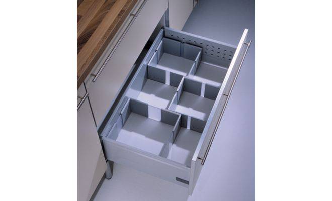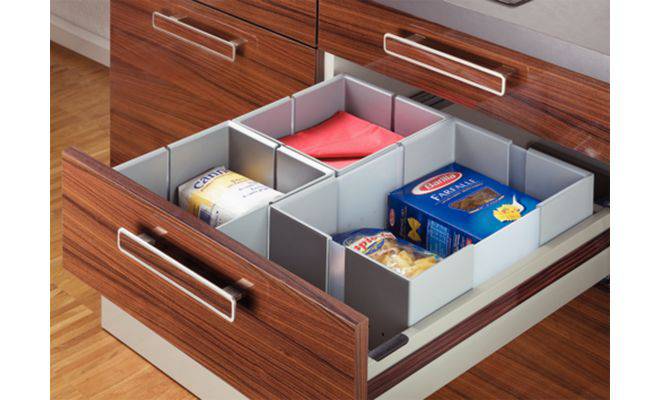 Вставки для кухонних ящиків – відмінне рішення для зберігання продуктів. Їх можна встановити так, щоб відокремити крупи, баночки зі спеціями і соусами, серветки та рушники. Вони пластикові. Легко миються.