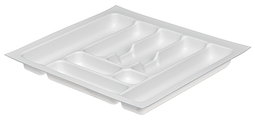 Вставка для столових приборів, для самостійного розкрою, матеріал: пластмаса, метод глибокої витяжки, колір: білий, в рубчик, товщина матеріалу 2.5 мм, висота 57 мм, для номінальної довжини 500 мм, для ширини корпуса 400 мм.