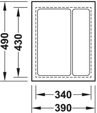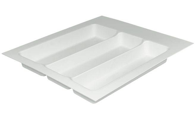 Вставка для столових приборів, з широкою кромкою для розкрою на точний розмір висувної шухляди, матеріал: пластмаса, метод глибокої витяжки, колір: білий, в рубчик, товщина матеріалу 2.5 мм, висота 57 мм, для номінальної довжини 500 мм, глибина 410-480 мм, для ширини корпуса 450 мм, ширина 330-390 мм.