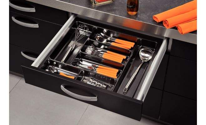 Вставка для столових приборів, для самостійного розкрою, матеріал: пластмаса, метод глибокої витяжки, колір: білий, в рубчик, товщина матеріалу 2.5 мм, висота 57 мм, для номінальної довжини 500 мм, для ширини корпуса 500 мм.