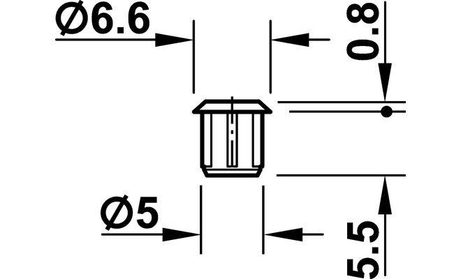 Заглушка для вдавлювання у глухий отвір діаметром - 5 мм. Заглушка виготовлена з пластмаси темно-коричневого кольору, розміри заглушки: діаметр голівки 6,6 мм, товщина голівки 0,8 мм, діаметр ніжки 5 мм, висота ніжки 5,5 мм.