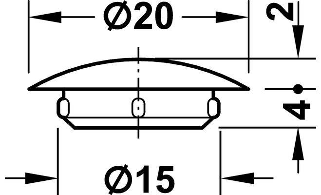 Заглушка для вдавлювання у глухий отвір діаметром - 15 мм, виготовлена з пластмаси білого кольору. Розміри заглушки: діаметр голівки 20 мм, товщина голівки 2 мм, діаметр ніжки 15 мм, висота ніжки 4 мм.