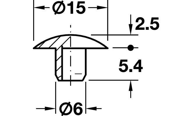 Заглушка для вдавлювання у глухий отвір діаметром - 6 мм, виготовлена з пластмаси білого кольору. Розміри заглушки: діаметр голівки 15 мм, товщина голівки 2,5 мм, діаметр ніжки 6 мм, висота ніжки 5,4 мм.