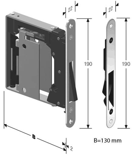Магнітний замок B-noha mini для міжкімнатних прихованих дверей з відповідною планкою в комплекті. Матеріал: сталь. Покриття / колір: хромована матова. Довжина лицьової пластини - 190 мм. Ширина - 22 мм. Глибина врізки - 130 мм. Цей замок легко встановлюється на всі двері без спеціальних фрезеровок для монтажу.
