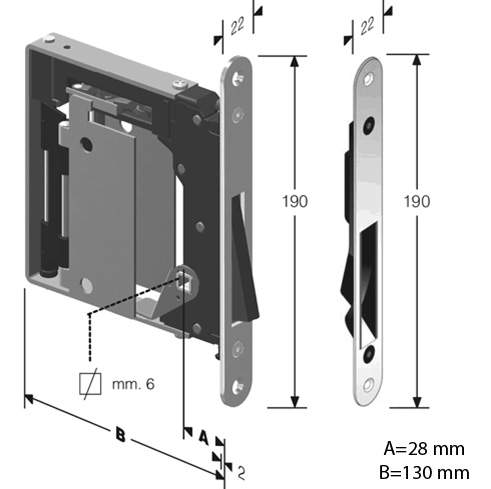 Магнітний замок B-noha mini WC для міжкімнатних прихованих дверей з відповідною планкою в комплекті. Матеріал: сталь. Покриття / колір: хромована матова. Довжина лицьової пластини - 190 мм. Ширина - 22 мм. Глибина врізки - 130 мм. Цей замок легко встановлюється на всі двері без спеціальних фрезеровок для монтажу.