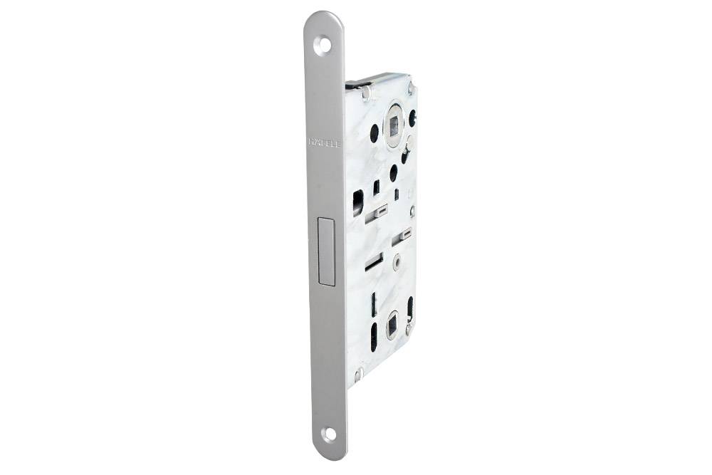 Врізний, для дверей з фальцем і без фальца. Універсальний: правий і лівий. Лицьова планка магнітного замка закруглена. Лицьова планка: сталь, колір: нікель полірований. Ригель замка: магніт, покритий пластмасою світло-сірого кольору. Розмір під чотиригранний штифт дверних ручок: 8 х 8 мм. Розмір під чотиригранний штифт нижнього блокування: 8 х 8 мм. Ширина лицьової планки магнітного замка: 18 мм. Висота лицьової планки магнітного замка: 196 мм. Глибина врізки магнітного замка: 75 мм. Ригель замка з вбудованим магнітом. Монтаж шляхом врізання.