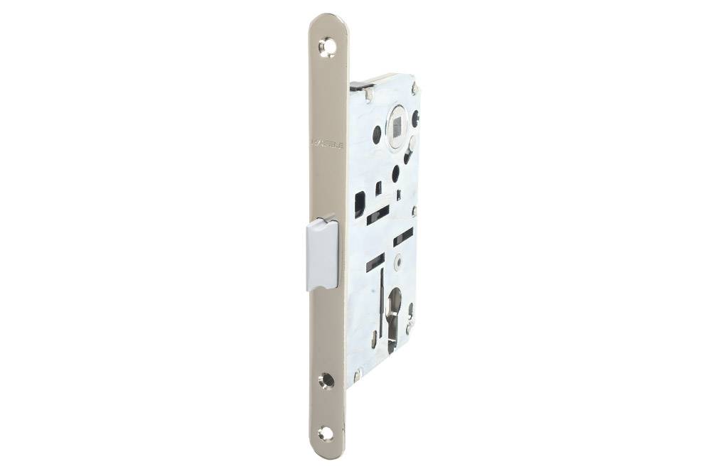 Лицьова планка врізного замка закруглена. Замок врізний, матеріал: Лицьова планка: сталь, нікельована полірована. Ригель з пластмаси забезпечує безшумне закриття дверей, без металевого дзвону. Розмір під чотиригранний штифт дверних ручок: 8 х 6 мм. Ширина лицьової планки врізного замка: 18 мм. Висота лицьової планки врізного замка: 196 мм. Глибина врізки замка: 75 мм. Ригель замка: для закриття і відкриття замка потрібно один оберт. Монтаж шляхом врізання.