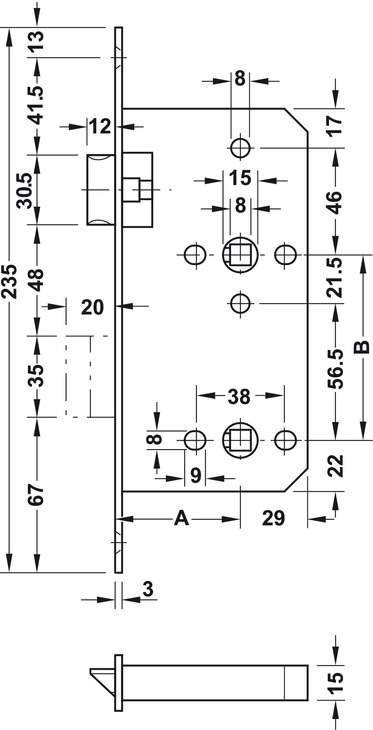 Технічні характеристики Замок врізний WC нержавіюча сталь золотий 55/24, форма квадратна 91125450